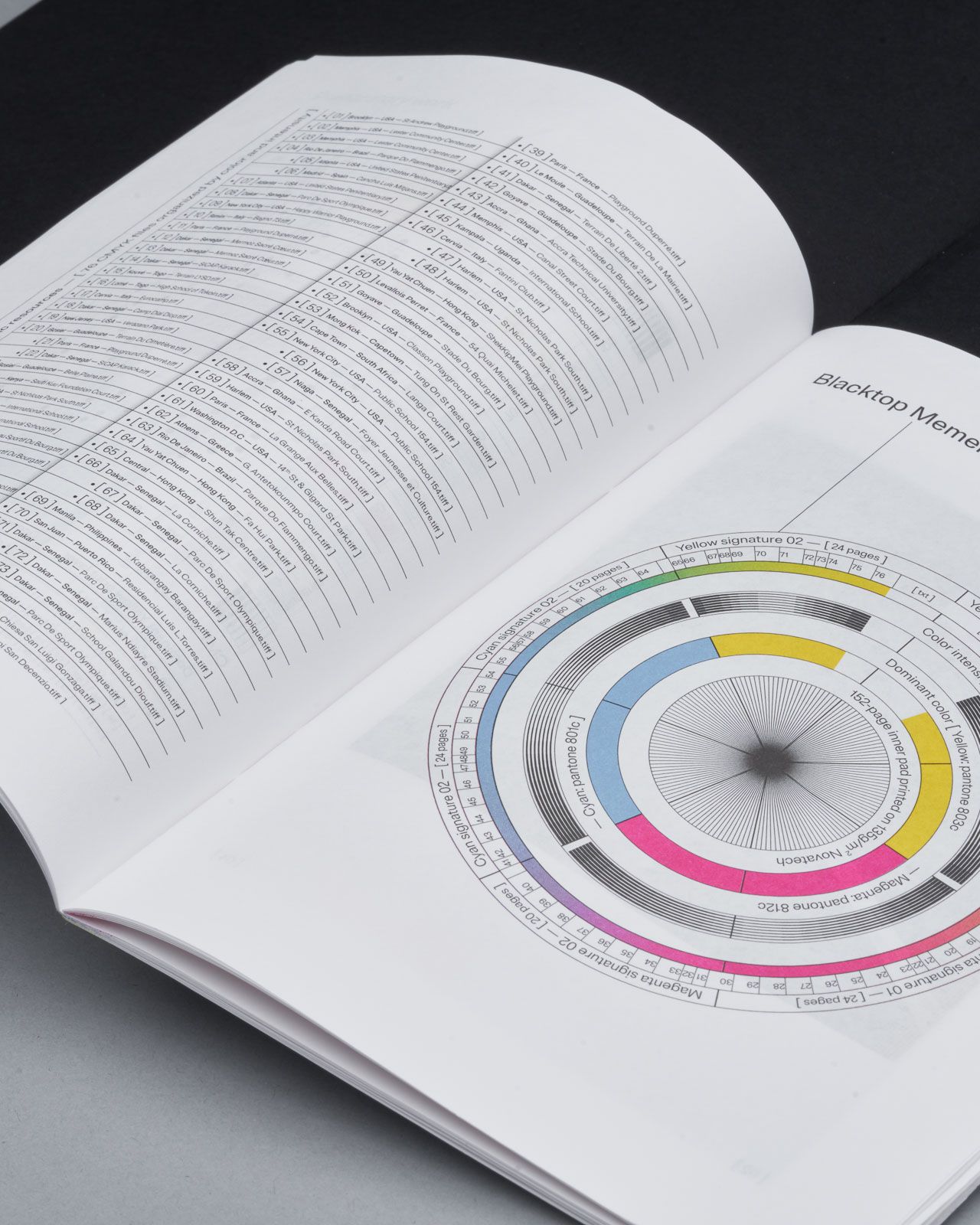 — Signed copy of Blacktop Memento, fragments of erosion 156 pages hardcover book printed on 135g/m2 Novatech satin paper using CMYK + fluorescent Pantone 812c + 803c + 801c inks.23.5 x 18 x 1.7 cm